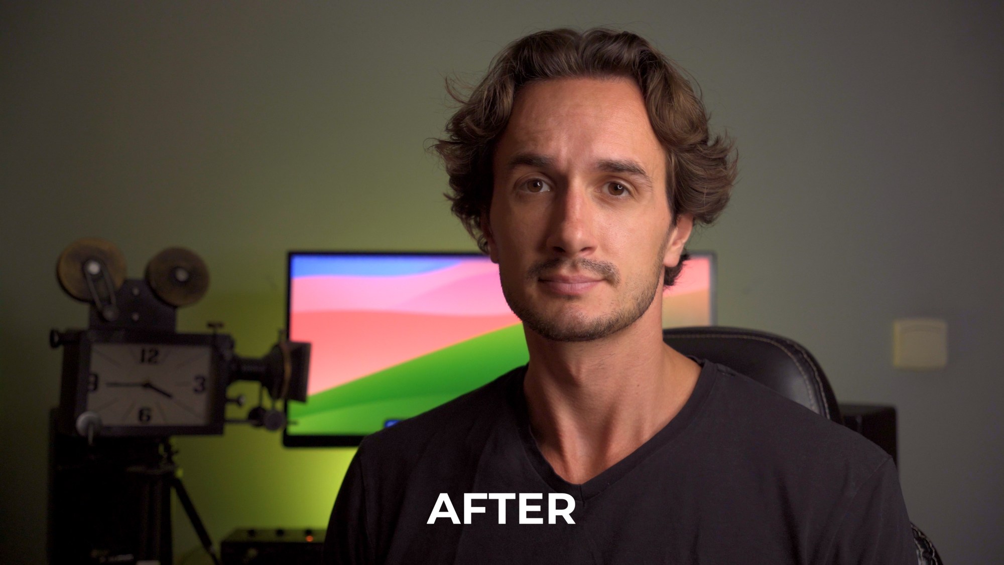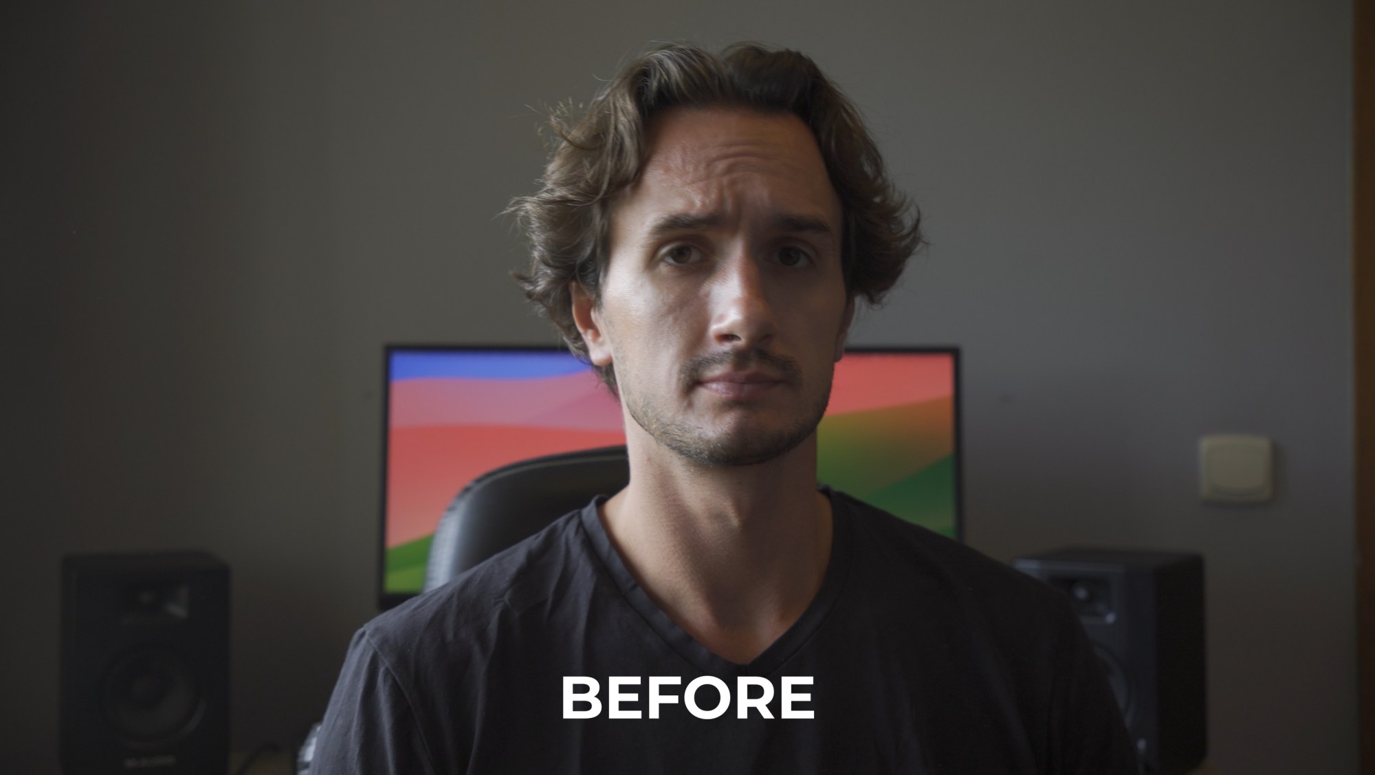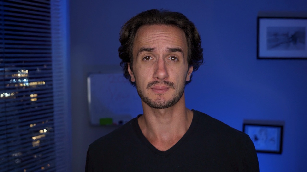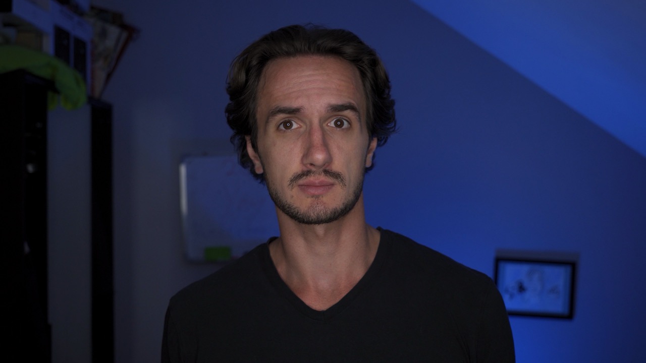 One of the biggest hacks is lighting. I mean that goes without saying, right? If a scene is lit well it’ll look good. Take a look at this shot, for example—me sitting at a desk with a plain wall behind me. Sometime this is all we get. A wall and a desk and the rest is up to us.