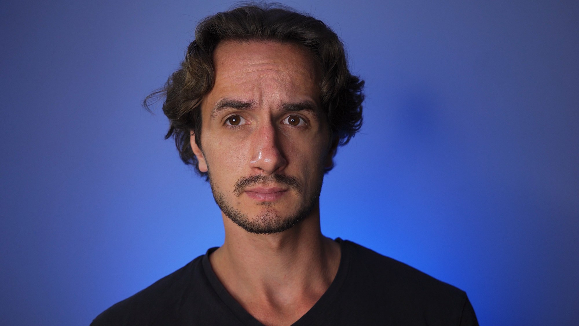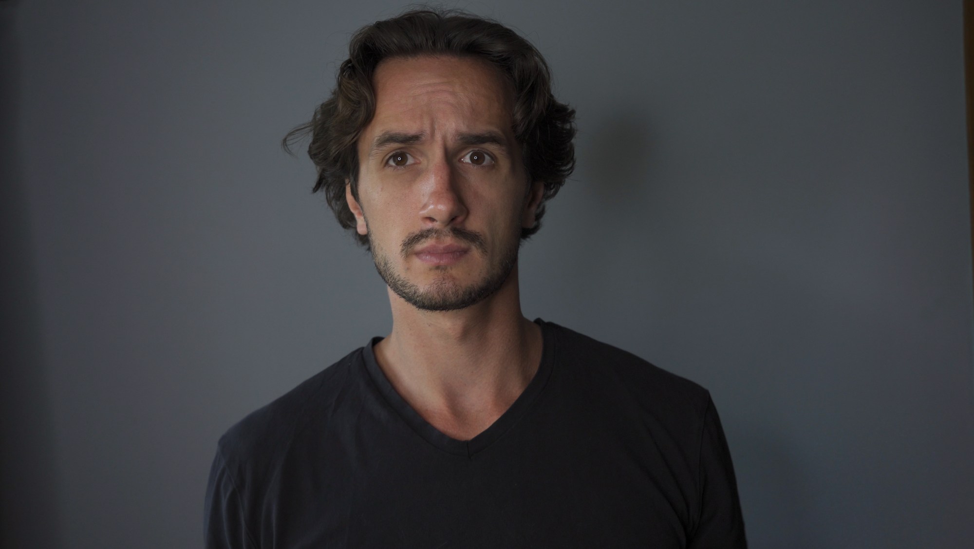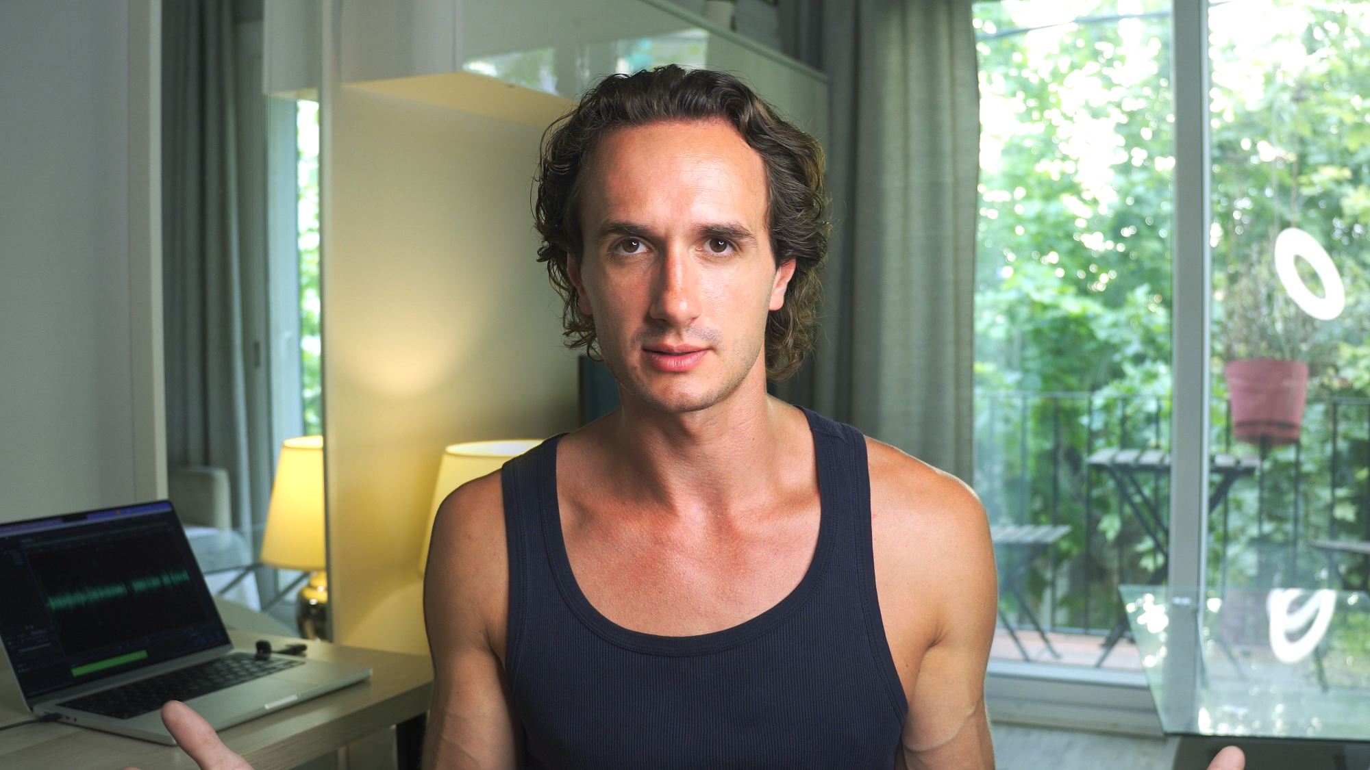 One of the biggest hacks is lighting. I mean that goes without saying, right? If a scene is lit well it’ll look good. Take a look at this shot, for example—me sitting at a desk with a plain wall behind me. Sometime this is all we get. A wall and a desk and the rest is up to us.