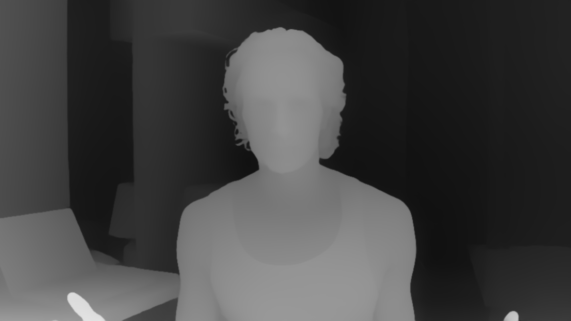 If you compare the depth levels of these shots you can see that in the first version the depth levels are less symmetric as the table and the laptop is creating a very subtle foreground. The deepest point of the image is slightly to the left, but because of the mirror we also have a very deep point right after the foreground. This depth distribution creates a more exciting and visually appealing look.