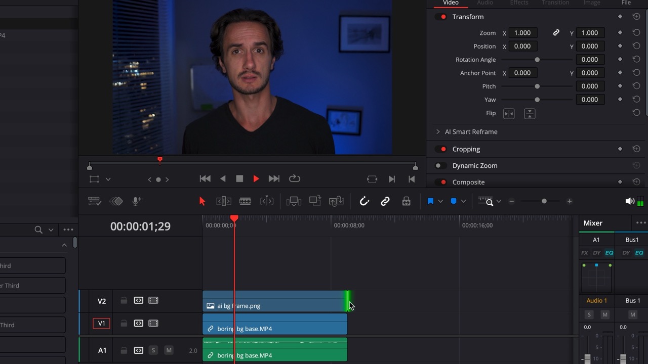 Having a dedicated studio to film in is a luxury. Even having a dedicated spot in your living space is often a challenge. However, perhaps what’s left is boring – like a plain wall, or part of the available background is just not visually appealing. Well, the good news is that you can use AI to extend or enhance your background without needing a green screen or rotoscoping. This technique could allow you to Accept jobs even if you physically couldn’t shoot in the required location. I will write about this and give you a more thorough tutorial in a dedicated article but I’ll go into it briefly now as well.