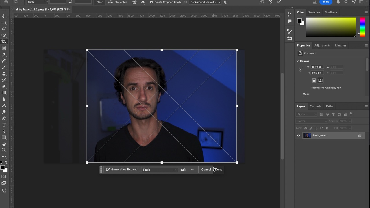 #7 With the crop tool, use a 16:9 aspect ratio and extend the background using the Generative AI feature.